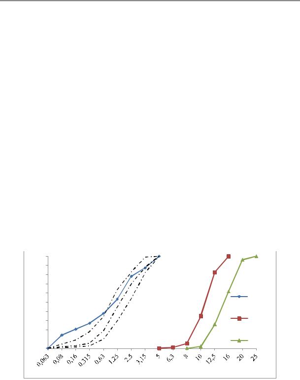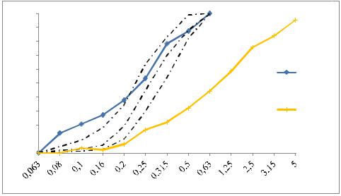 2.6. Recovery Filler. We used fine particles which are available at HMA plants. In our case the fines were obtained from the HMA plants of El-Djzira and El-Arabiya. This RF is obtained from drying of sand and stone in a rotating drum at the temperatures between 150 °C and 180 °C. The chemical composition, physical properties and grading curve of the RF are presented in Table 4 and in Fig. 2.The significant findings to note are the presence of high percentages of SiO2 and CaO, which exceeds 20 % and 44 %, respectively.