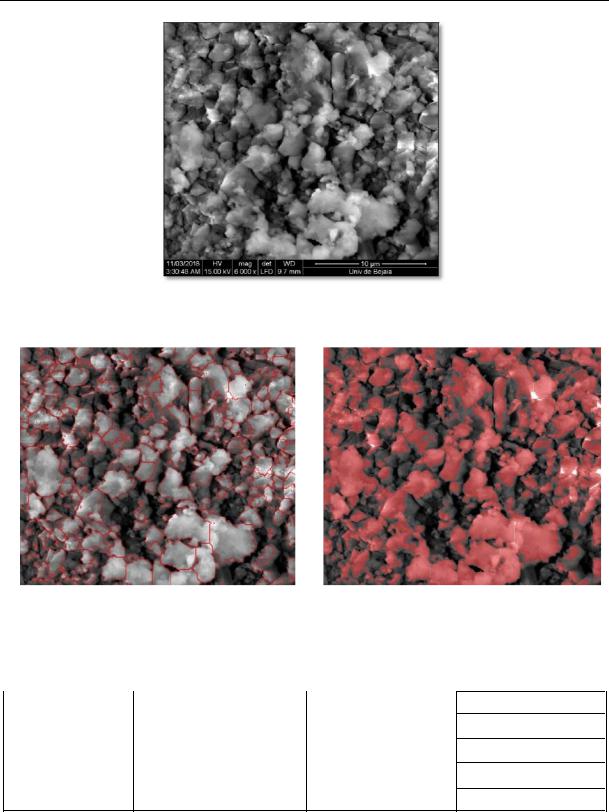 3. Characterization of RF with Aphelion Lab 4.4 and Astra 1.6 Software Packages. The present section assesses the output values that characterize the RF (compactness, elongation, fill ratio and average diameter) obtained with the Aphelion Lab 4.4 and Astra 1.6 software packages. The microscopic morphology of the RF particles from a scanning electron microscopy (SEM) image is displayed in Fig. 3. After opening the SEM image with Aphelion Lab 4.4, output values characterizing the RF were obtained. These are presented in Fig. 4 and 5 as well as in Table 5. We also used the Astra 1.6 software package for segmentation and measurement of average diameters. These results are given in Fig. 6.