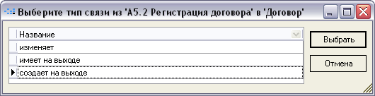 При добавлении связи между двумя элементами на диаграмме будет выдано окно для выбора типа связи между этими элементами (рис. 7.5). Если в справочнике типов связей между данными элементами существует только одна запись – будет автоматически создана связь с этим типом.