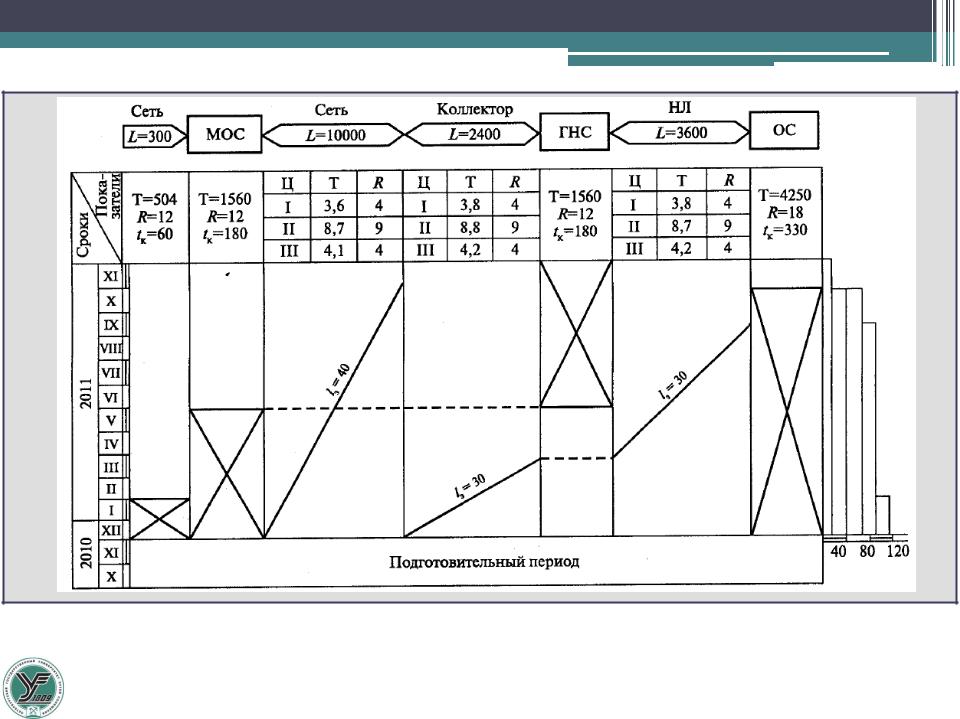 МОС – местная очистная станция; ГНС – главная насосная станция; НЛ – напорная линия; ОС – очистные сооружения; Ц – номер цикла; Т- трудоемкость; R – количество рабочих; tк – продолжительность сооружения объекта.