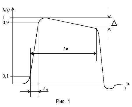 В задании сформулированы требования к допустимым переходным искажениям импульса. Эти требования охарактеризованы предельно допустимым значением длительности нарастания фронта tн импульса (рис. 1), а также допустимым спадом его вершины ∆ при заданной предельной его длительности tи. В задании оговаривается, как полярность выходного импульса ("+" или "-"), так и его предельное значение амплитуды Uм. Питание усилителя