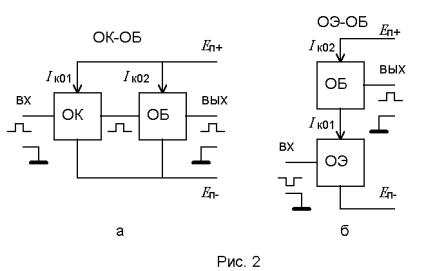 В предоконечных и входных каскадах можно в ряде случаев от выполнения указанного принципа отказаться. На рис.2 представлены структурные схемы двухтранзисторных усилительных звеньев, которые, как правило, выполняются на транзисторах с одинаковой проводимостью.