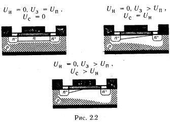 Работа МДПТ основана на управлении проводимостью цепи исток-сток с помощью напряжения на затворе. Когда напряжение на затворе отсутствует, электрическая цепь исток-сток представляет собой два n+-перехода, включенных навстречу друг другу. Ток в такой цепи очень мал и равен току обратносмещенного перехода. При подачи на затвор достаточно большого положительного напряжения в подзатворной области полупроводника индуцируется инверсный слой (канал) n-типа проводимости, соединяющий n+- области истока и стока. Теперь если увеличивать положительное напряжение на стоке, то ток в цепи исток-сток будет сначала линейно нарастать, а затем (VD≥VDsat) произойдет насыщение. Насыщение тока стока при фиксированном напряжении на затворе связано с сужением проводящего канала со стороны стока и с сокращением его длины при увеличении VD. На рис. 2.2 схематично показаны сечения транзистора, иллюстрирующие влияние напряжения смещения на конфигурацию канала и обедненной области. В приближении плавного канала, однородного легирования и при учете только дрейфовой составляющей тока, а также полагая независимость подвижности от значения электрического поля, ток стока ID можно определить как: