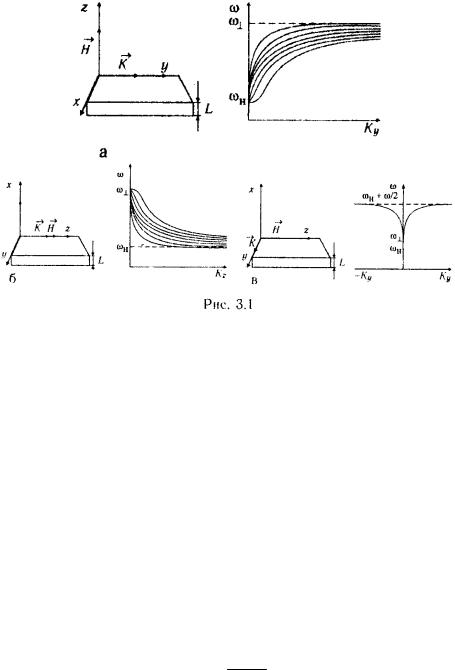 При продольном распространении (К ⁄⁄ Н как и в случае перпендикулярного намагничивании, спектр объемных спиновых волн заключен в интервале частот (рис. 3.1, 6). Однако ход дисперсионных кривых существенно иной. Дисперсионные кривые ω = f(Кz) имеют отрицательный наклон (отрицательную групповую скорость) во всей области спектра. Они начинаются при К = О в точке (о = о Таким образом, эта частота определяет частоту ферромагнитного резонанса касательно намагниченной пленки.