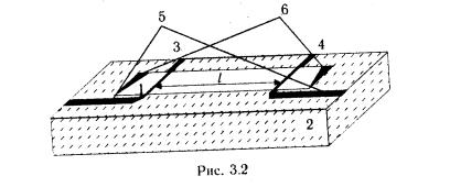 Линия задержки (ЛЗ) на магнитостатических волнах (МСВ) – линейный спин-волновой прибор. ЛЗ на МСВ рассчитана на работу в СВЧ-диапазоне. Конструкция ЛЗ на МСВ представлена на рис. 3.2. Ферромагнитная пленка 1 расположена на диэлектрической подложке 2. С помощью входного преобразователя 3 (антенны) происходит преобразование энергия электромагнитной волны в энергию спиновой волны. Спиновая волна распространяется по пленке и достигает выходной антенны 4, где происходят обратное преобразование спиновой волны в электромагнитную. Как правило, в ЛЗ используются одноэлементные антенны, как наиболее широкополосные. Входная и выходная антенны подключаются к линиям связи 5 (например, к микрополосковым линиям), которые могут содержать дополнительные элементы согласования. Ферромагнитная пленка, снабженная поглотителями спиновых волн 6, вместе с преобразователем помещается в зазор магнита, обеспечивающего создание воля подмагничивания необходимых значения в направления. Все устройство помещается в корпус, который сам является элементом подмагничивающей системы.