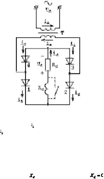 Предлагаемая лабораторная работа позволяет исследовать работу однофазного мостового неуправляемого управляемого выпрямителя. Принципиальная схема исследуемой схемы представлена на рисунке 1.1.