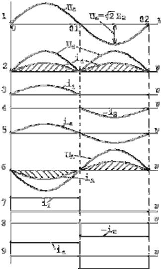 осях 2, 3, 4, 5 и 6 рис.1.2. На осях 7,8 и 9 приведены эпюры токов вентилей и потребляемого фазного тока при