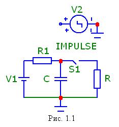 Схема генератора, выполненная в программном средстве Micro-Cap 9, изображена на рис. 1.1, где V1 – источник питания; С – емкостный накопитель; R1 – зарядное сопротивление; R – сопротивление нагрузки; S1– полностью управляемый ключ, V2 IMPULSE – источник управляющего напряжения. Схема работает следующим образом: в течение времени заряда τ