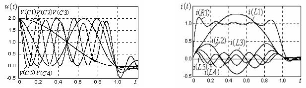 На рис. 2.4 представлены временные зависимости напряжений на емкостях, а на рис. 2.5 – токов нагрузки и индуктивных элементов пятиконтурного ФД,