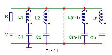 Однако ввиду того, что ФД состоит из конечного числа элементов L и С, сформировать с помощью такой схемы импульс точно прямоугольной формы невозможно. Тем не менее, при определенном выборе значений элементов L и С удается получать в нагрузке импульс с крутым фронтом и отчетливо выраженной плоской вершиной, т. е. импульс, форма которого близка к прямоугольной. Формирующий двухполюсник 1-го рода, состоящий из n параллельно соединенных последовательных LC-контуров и зарядного устройства, изображен на рис. 2.1. Период собственных колебаний k-й ветви ФД 1-го канонического вида, состоящей из бесконечно большого числа таких ветвей, должен удовлетворять равенствам: