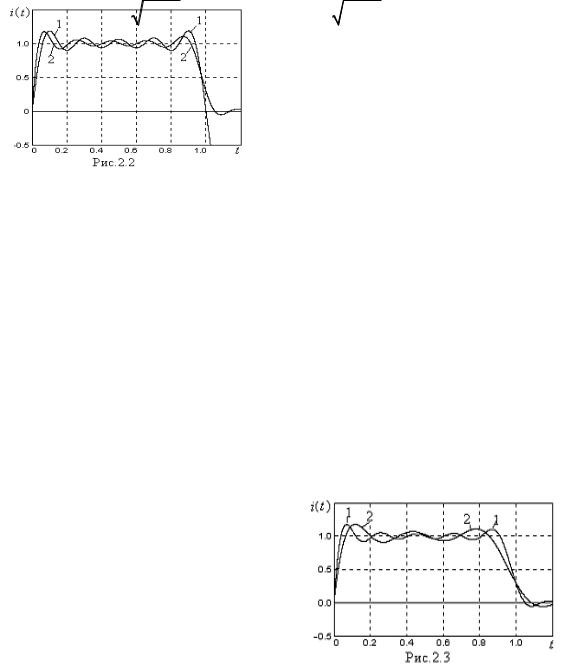 Таким образом, значения индуктивностей всех ветвей одинаковы, а значения емкостей убывают с возрастанием номера k ветви. Если бы емкость n-контура оказалась равной нулю (при n ), то сопротивление этого контура было бы бесконечно большим на всех частотах и никак не влияло бы на процессы в схеме. Цепь 1-го канонического вида с параметрами, рассчитанными по формулам (2.1), формирует импульс с довольно крутым фронтом, но большими наложенными колебаниями на вершине. Формы единичного импульса тока короткозамкнутого и нагруженного ФД приведены на рис. 2.2 (кривые 1 и 2 соответственно). Формы единичного импульса тока при количестве контуров n = 5 и n = 3 приведены на рис. 2.3 (кривые 1 и 2 соответственно). Так как увеличение числа контуров практически не изменяет амплитуду наложенных колебаний, то целесообразно ограничиться небольшим количеством контуров (не более 3– 5), которое зависит от требований, предъявляемых к крутизне фронта импульса.