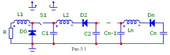 рассогласованные с нагрузкой (ρ > Rн). Однако при этом существенно ограничиваются частотные свойства генераторов из-за длительного переходного процесса в линии, определяемого добротностью реактивных элементов, после размыкания ключа. Выходом из данной ситуации является применение однородной искусственной линии с вентилями (ОИЛВ) (рис. 5.1). ОИЛВ является физическим аналогом линии с распределенным диодом (ЛРД) и получается разбиением ЛРД на ряд равных по длине отрезков и