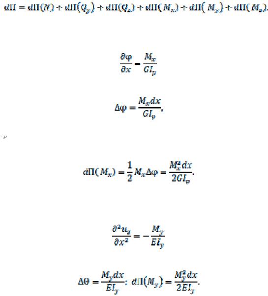 участку рассмотрим эти внутренние силы как внешние. Определим работу, совершаемую этими силами при деформировании элемента. Она равна потенциальной энергии, накопленной в элементарном участке стержня. Допустим, что левое сечение элемента неподвижно. Точка приведения сил в правом сечении перемещается. При этом совершается работа. Полная потенциальная энергия элемента стержня может рассматриваться как сумма независимых работ каждого из шести силовых факторов: