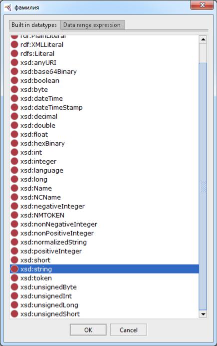 рядом с пунктом Ranges в панели Description в правой части окна. Откроется окно, содержащее список стандартных типов данных XML Schema (рис. 1.12), которые используются в языке OWL в качестве значений примитивных свойств.