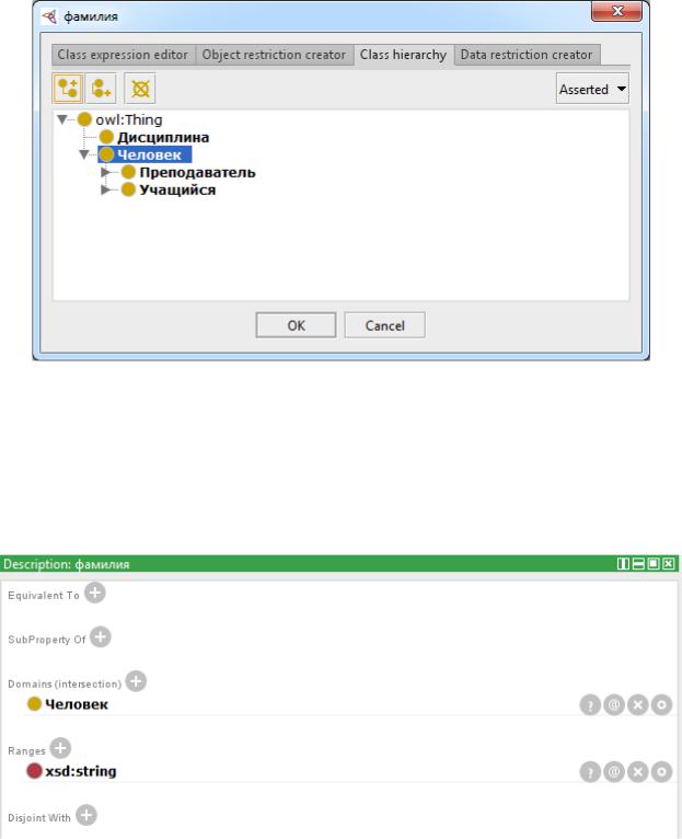Панель Description для свойства фамилия примет вид, показанный на рис. 1.14. Таким образом, определено, что свойство фамилия относится к классу Человек и может принимать значения строкового типа.