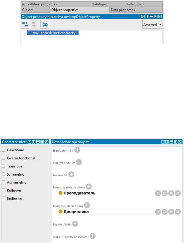 4.6. Теперь создадим у класса Преподаватель объектное свойство преподает. Убедитесь, что выбрана вкладка Entities и выберите вложенную вкладку Object properties. Выберите свойство topObjectProperty (рис. 1.15).