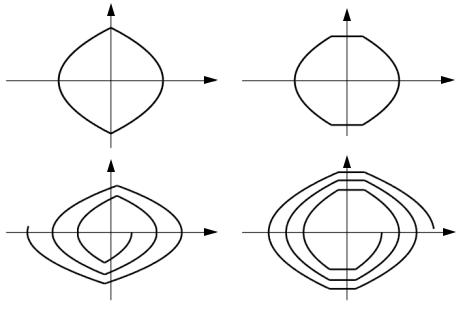 Рис. 5.3. Фазовые траектории системы второго порядка: а – с двухпозиционным реле; б – с трехпозиционным реле; в – с гистерезисом; г – с трехпозиционным реле с гистерезисом