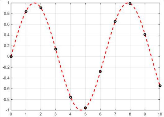 они различаются по цветам согласно принятой по умолчанию последовательности: синий – зеленый – красный и т. д. Общий формат функции plot(x1, y1, S1, x2, y2, S2…) позволяет управлять типом линии, ее цветом и типом маркера за счет символьной константы S. Возможные значения константы можно посмотреть в таблице с помощью команды help plot. Пример использования функции plot для управления графиком приведен ниже.
