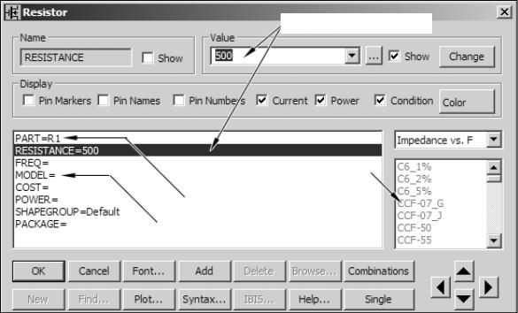 При добавлении каждого компонента в схему необходимо задать его атрибуты: позиционное обозначение (осуществляется автоматически, но можно впоследствии поменять), номинальное значение и (или) модель. Для задания этих параметров открывается специальное окно (рис. 3.2). Для всех компонентов Micro-Cap 9 эти окна имеют примерно одинаковую структуру. Для большинства пассивных компонентов модель указывать не обязательно (хотя это возможно). Если указана модель, то активными становятся поля с ее параметрами в нижней части окна (на рис. 3.2 не показаны).