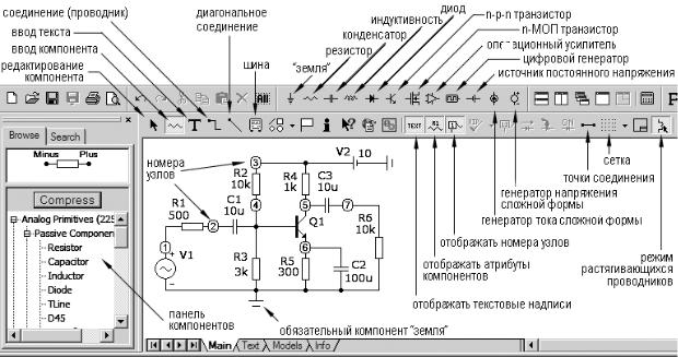 При запуске программы открывается главное окно Main, в котором сразу можно приступить к рисованию схемы (рис. 3.1). При ее построении выбор компонентов осуществляется через пункт меню Component. Ряд часто используемых компонентов вынесен на главную (верхнюю) панель. Этот набор можно менять по своему усмотрению. Помимо этого, в Micro-Cap 9 есть отдельная панель компонентов, по умолчанию расположенная в левой части экрана. Она значительно повышает удобство выбора необходимых компонентов (в более ранних версиях ее нет). Панель компонентов включается/отключается командой меню Options>Panel.
