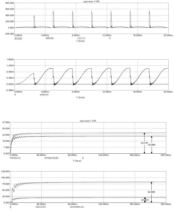 Результатом численных расчетов должны быть величины действующих и средних значений токов и действующих и максимальных значений напряжений отдельных элементов, величины потерь в элементах модулятора и общий КПД. Кроме этого, должны быть приведены временны́е зависимости зарядного тока и тока нагрузки.