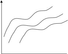 Рис. 3.1. Графическое изображение однофакторной зависимости (сплошная линия) и ее полосы неопределенности (штриховые линии)