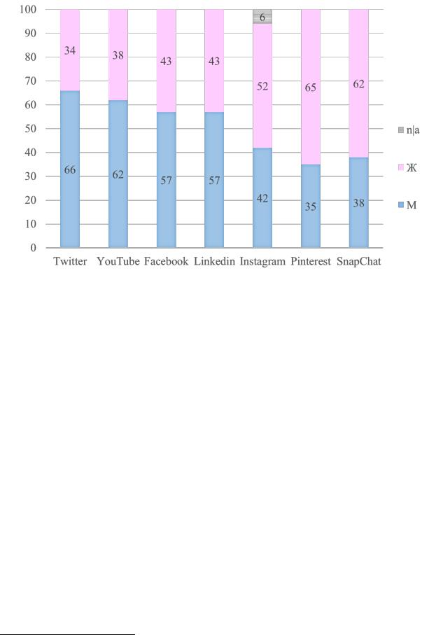 Гендерные различия в общении наглядно можно изучать по поведению мужчин и женщин в социальных сетях и интернете. Статистические данные показывают, что мужчины и женщины предпочитают разные площадки: женщин больше в социальных сетях, ориентированных на общение и с преобладанием визуального контента («Instagram», «Pinterest», «Вконтакте»), а мужчин в социальных сетях привлекают возможности высказываться и дискутировать на актуальные темы, получать полезную информацию и расширять деловые контакты («YouTube», «Facebook», «Linkedin») (рис.1.1). Однако стоит учитывать культурные особенности: в некоторых странах женщины более представлены в социальных сетях (Россия, Юго-восточная Азия), а в других – менее (Ближний Восток, Индия).