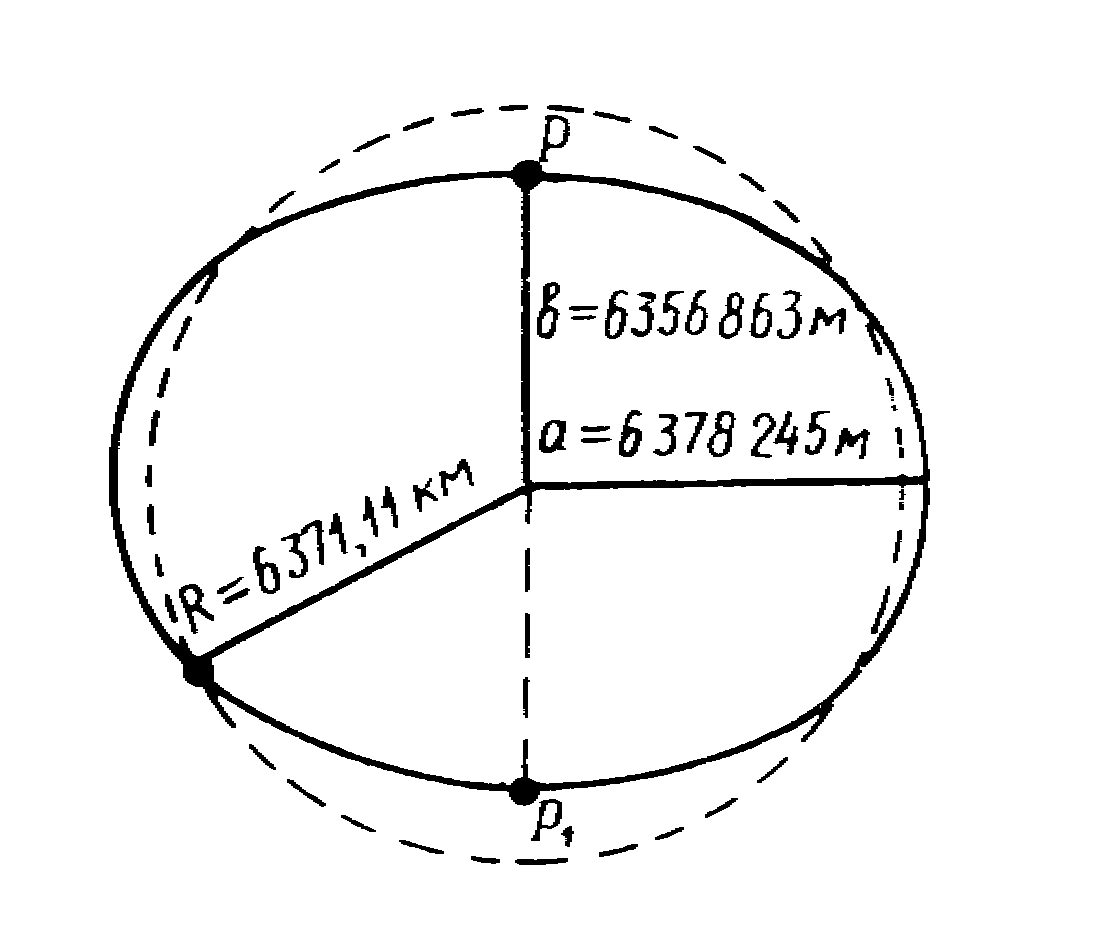2. ФОРМА И РАЗМЕРЫ ЗЕМЛИ. Геоид, референц-элипсоид, шар. Общая форма Земли как материального тела определяется действием внутренних и внешних сил на ее частицы, т.е. поверхность Земли образует фигуру неправильной, сложной формы. При определении фигуры и размеров Земли в геодезии вводится понятие уровенных поверхностей. Основная уровенная поверхность – это поверхность воды в океанах и собирающимися с ними морями, в состоянии полного покоя и равновесия, мысленно продолженная под материками так, чтобы она пересекала направление отвесной линии под прямым углом (90'). Направление отвесной линии к уровневой поверхности в геодезии принимают за одну из осей координат. Фигура Земли, ограниченная основной уровенной поверхностью, называется – геоид. Вследствие особой сложности, геометрической направленности геоида его заменяют другой фигурой – эллипсоидом, который получается от вращения эллипса вокруг его малой оси PP1. (a=6378245м; b=6356863м; сжатие =(a-b)/a=1/298,3; R=6371,11км).