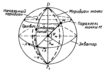В системе географических координат местоположение проекции точки на сфероиде определяется двумя углами: широтой и долготой (рис. 34).