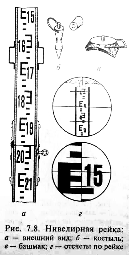 Нивелирная рейка (рис. 7.8, а) состоит из двух брусков двутаврового сечения, соединенных между собой металлической фурнитурой. Это позволяет складывать рейку для транспортирования. Рейка имеет градуировку на обеих сторонах.