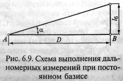 погрешности при определении расстояния 50 см; на расстоянии до 100 м — до 0,2 сантиметрового деления или погрешности 20 см. Нитяным дальномером можно измерить линии длиной до 300 м с погрешностью до 1:300 от длины. Принцип действия дальномера с постоянным базисом рассмотрим на конкретном примере определения расстояния от точки А до точки В (рис. 6.9). В точке А устанавливают теодолит. В точке В располагают отрезок (базис), длина которого lб точно известна. Тогда, измерив угол а, можно по известной из тригонометрии формуле D = lб tg а вычислить расстояние между точками А и В.