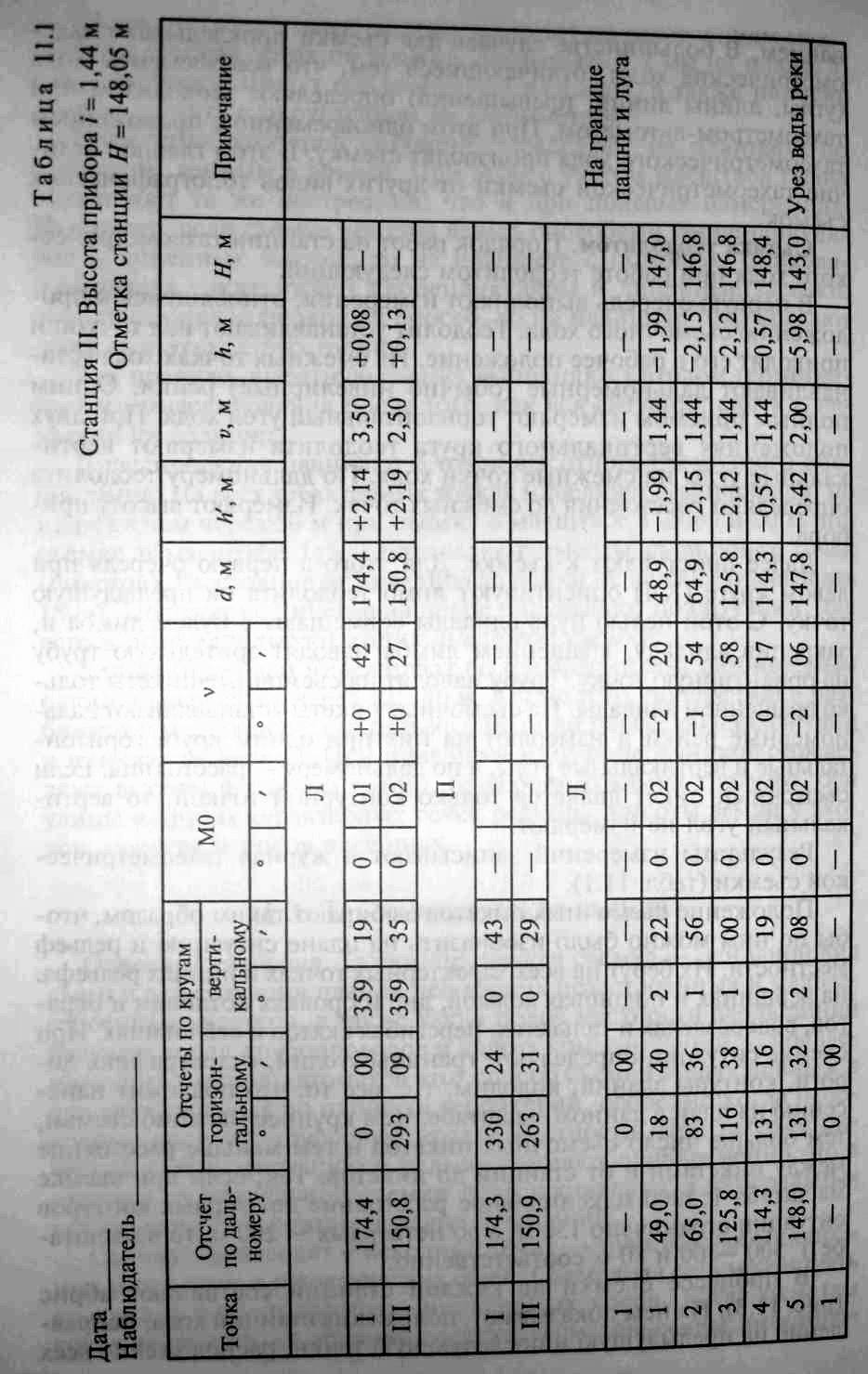углы, а по дальномеру — расстояния. Если съемочный пикет является только контурной точкой, то вертикальный угол не измеряют. Результаты измерений записывают в журнал тахеометрической съемки (табл. 11.1). Положение съемочных пикетов выбирают таким образом, чтобы по ним можно было изобразить на плане ситуацию и рельеф местности. Их берут на всех характерных точках и линиях рельефа: на вершинах и подошвах холмов, дне и бровках котловин и оврагов, водоразделах и тальвегах, перегибах скатов и седловинах. При съемке ситуации определяют: границы угодий, гидрографию, дороги,