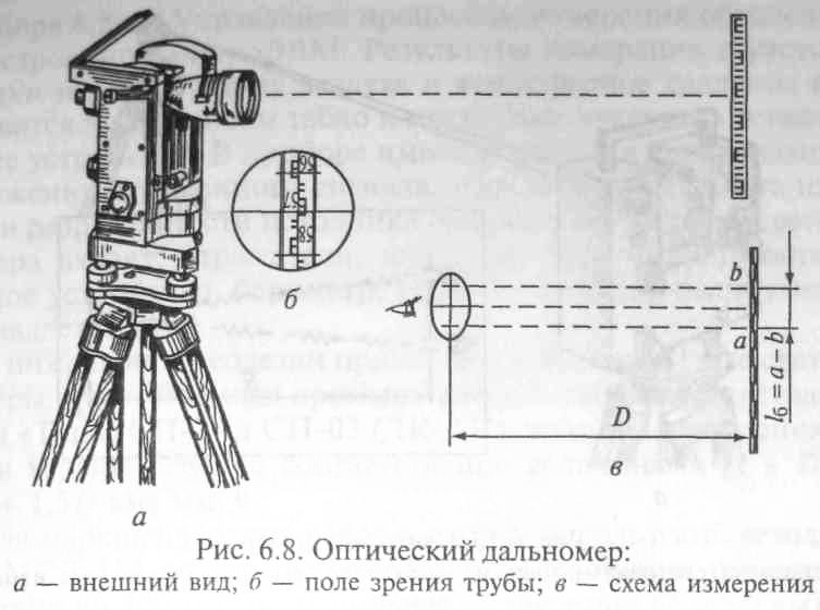 Дальномерами называются геодезические приборы, с помощью которых расстояние между двумя точками измеряют косвенным способом. Дальномеры подразделяют на оптические и электронные. Оптические дальномеры делятся на дальномеры с постоянным параллактическим углом и дальномеры с постоянным базисом, электронные дальномеры — на электронно-оптические (светодальномеры) и радиоэлектронные (радиодальномеры). Простейший оптический дальномер с постоянным углом — нитяной (рис. 6.8, а) имеется в зрительных трубах всех геодезических приборов. В поле зрения трубы (рис. 6.8, б) прибора видны три горизонтальные нити. Две из них, расположенные симметрично относительно средней нити, называются дальномерными. Нитяной дальномер применяют в комплекте с нивелирной рейкой, разделенной на сантиметровые деления. В приведенном примере между крайними нитями располагаются 21,5 сантиметровых делений рейки. Расстояние D между измеряемыми точками на местности 21,5-100 = 21,5 м (100 — коэффициент дальномера). На расстоянии до 200 м по нитяному дальномеру «на глаз» можно отсчитать до 0,5 сантиметрового деления, что соответствует