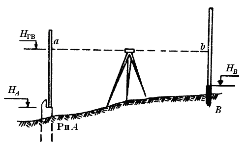 Пусть требуется вынести на местность точку В с проектной отметкой НВ (рис. 1.25). Для выполнения этой задачи способом выведения посередине между точкой В и репером А с отметкой НA устанавливают нивелир. Производят отсчет а по рейке на репере и находят горизонт инструмента (визирования) НГВ = HА + а. Вычисляют отсчет b по рейке на точке В, при котором пятка рейки будет на проектном уровне b = HГВ – HB. Затем рейку устанавливают в точке В так, чтобы отсчет по ней был равен вычисленному значению b. На коле, забитом предварительно в точке B, под пяткой рейки карандашом фиксируют высотное положение искомой точки.
