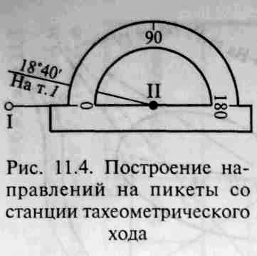 Вслед за этим наносят на план пикетные точки циркулем-измерителем, масштабной линейкой и транспортиром. Данные для нанесения берут из журнала тахеометрической съемки. Направление на пикеты со станции (рис. 11.4) строят по транспортиру.