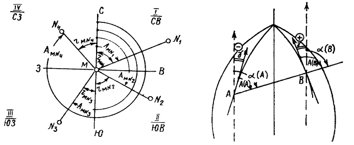 Рис.9.2 Зависимость между прямым и обратным дирекционными углами и обратным истинными азимутами
