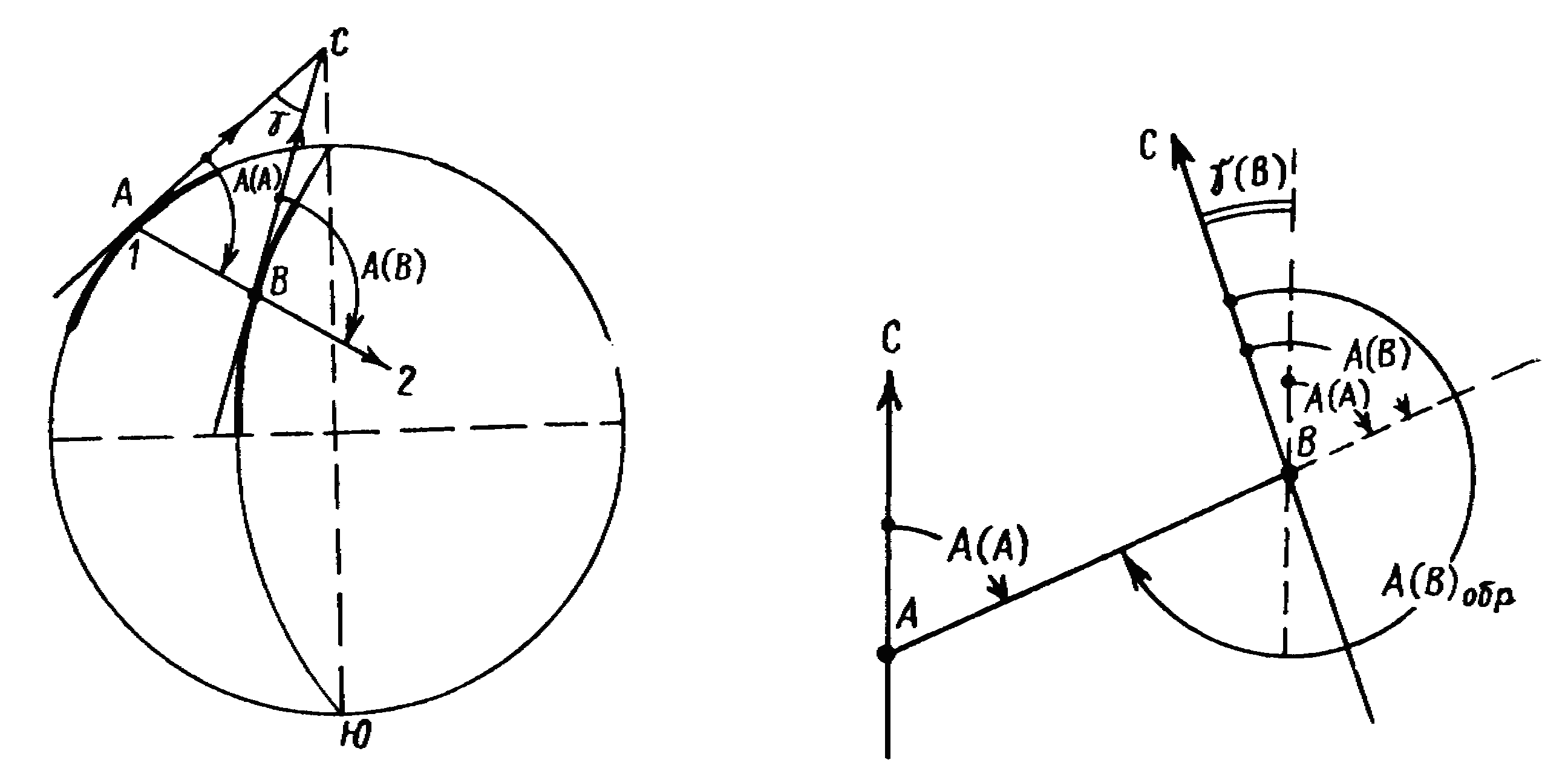 В геодезии пользуются терминами: прямое направление линии и обратное. Так, если исходное направление линии – направление АВ (см. рис. 41), то обратное направление – направление ВА. Соответственно азимут линии АВ будет прямым, линии ВА – обратным (т.е. А(А), А(В) – азимуты прямые, А(В)обр – азимут обратный). Зная азимут прямой в точке А(А) и сближение меридианов (В), можно вычислить азимут обратный в точке В. В данном случае А(В)обр = А(А) + 180 + (В).