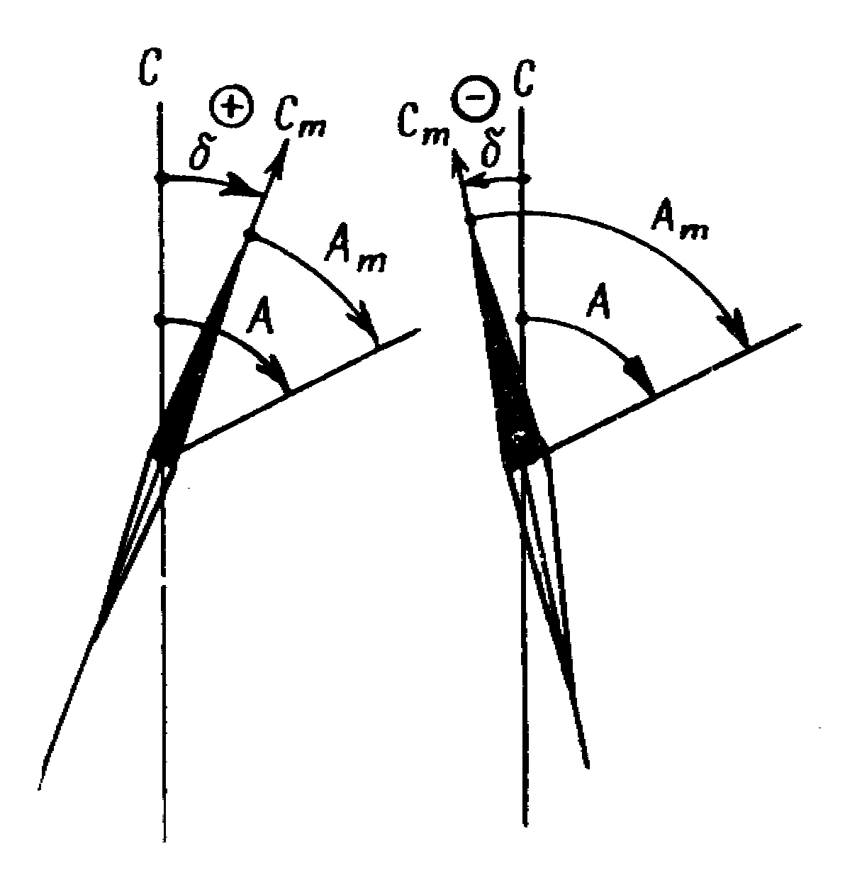 Магнитный меридиан, как правило, не совпадает с географическим. Угол, образованный этими меридианами, называется магнитным склонением (см. рис. 44). Приписывая восточному склонению знак плюс, а западному минус, во всех случаях получаем: А = Ат + .