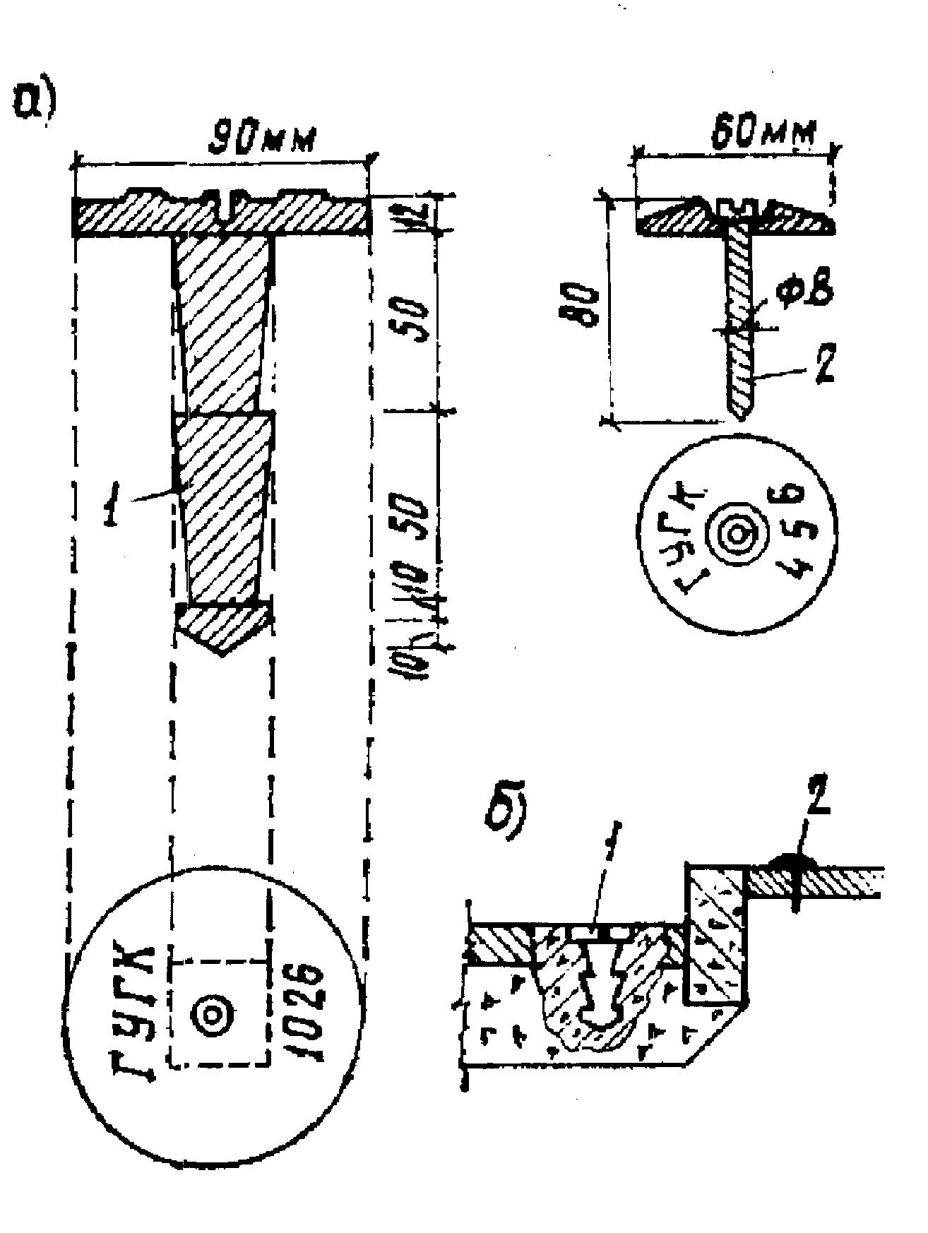 с твердым покрытием: 1 марка; 2 дюбель-гвоздь;