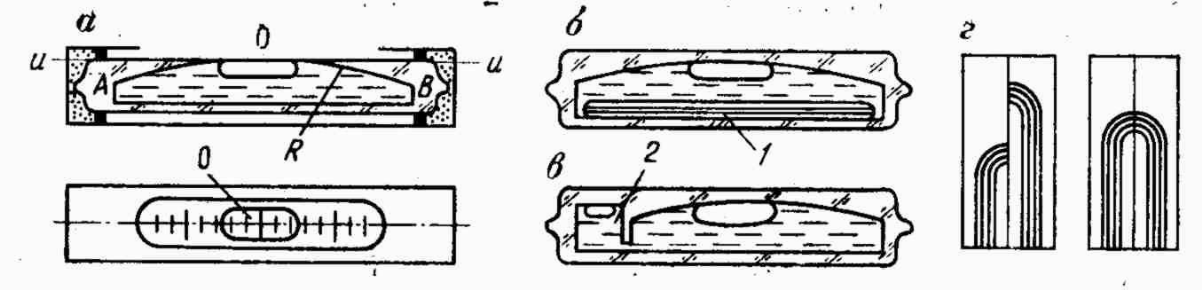 Цилиндрический уровень. Цилиндрический уровень (рис. 85, а) представляет собой стеклянную трубку (ампулу), внутренняя поверхность которой в вертикальном продольном разрезе имеет вид дуги АВ круга радиуса от 3,5 до 200 м. При изготовлении уровня ампулу заполняют легкоподвижной жидкостью (серным эфиром или спиртом), нагревают и запаивают. После охлаждения внутри ампулы образуется небольшое пространство, заполненное парами жидкости, которое называется пузырьком уровня. Для защиты от повреждений ампула заключается в металлическую оправу, заполненную гипсом. Юстировка уровня, т. е. его установка на приборе в требуемом положении, выполняется исправительными винтами.