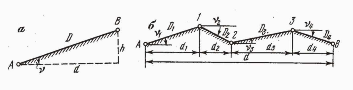 Для перехода от наклонной длины линии к горизонтальной ее проекции необходимо знать угол наклона линии к горизонту v либо превышение h между конечной и начальной точками линии (рис.102, а).