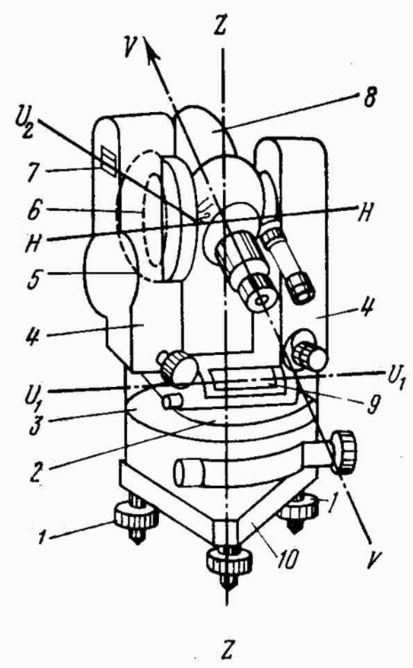 Визирование на наблюдаемые цели осуществляется зрительной трубой 8, визирная ось VV которой при вращении трубы вокруг горизонтальной оси НН образует проектирующую плоскость, называемую коллимационной. Зрительная труба соединена с алидадой горизонтального круга с помощью колонки 4. На одном из концов оси вращения зрительной трубы закреплен вертикальный круг 5, имеется цилиндрический уровень 7. Зрительная труба имеет закрепительный и наводящий винты.
