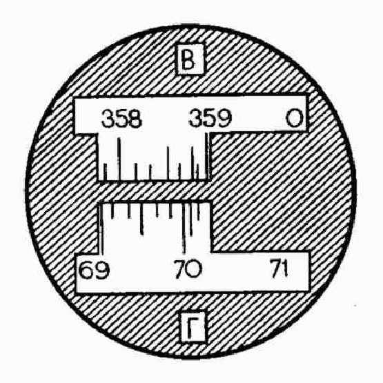 поле зрения такого микроскопа видны изображения лимба и шкалы, длина которой равна изображению наименьшего (обычно градусного) деления лимба. Индексом для отсчета служит штрих лимба, расположенный в пределах шкалы (рис. 81). На рис. 81, а показано поле зрения шкаловогомикроскопа теодолита Т5, имеющего шкалы для горизонтального и вертикального кругов, каждая из которых разделена на 60 частей.