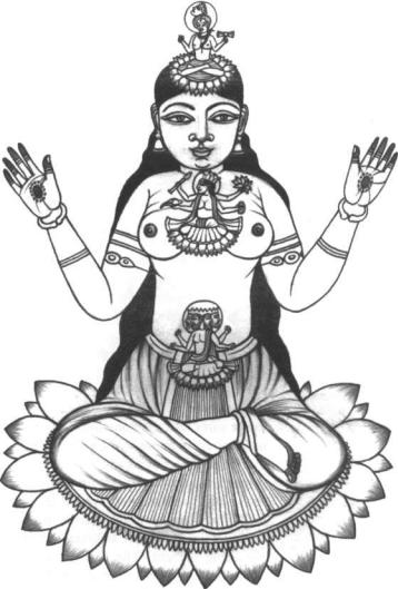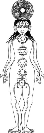 The Subtle Body of the later Hindu tradition, with symbolic representations of elements at each Chakra. This type of psycho-cosmogram illustrates the natural order of elements according to Yogic teachings. Subtle nerves leading from the feet to the sexual center, and from the hands to the throat center, are shown. From a Nepalese painting of the seventeenth century.