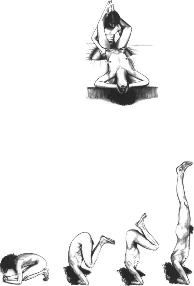 The Yoga head stand (shirsasana) helps reverse the involuntary outward flow of energy. First the hands should form a comfortable support for the head, by interlocking the fingers. A triangular shape should be made with the hands and elbows, the upper part of the head placed carefully into the palms, and the weight gradually taken. Slowly the feet should be brought up close to the elbows, lifted up and straightened. The Yoga head stand should not be rushed; the "base" of interlocked hands and the two elbows should be carefully held, and breathing focused at the navel region. Practiced with care, the Yoga head stand ensures a proper blood supply to the pituitary, pineal, and thyroid glands and tones up the whole body. It is particularly helpful in overcoming loss of