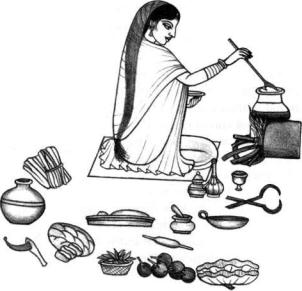 Yogic cookery requires that all ingredients be carefully cleaned and prepared before being mixed. The mental attitude is believed to influence the subtle tastes of food. From an Indian miniature painting, Chamba, circa 1810.