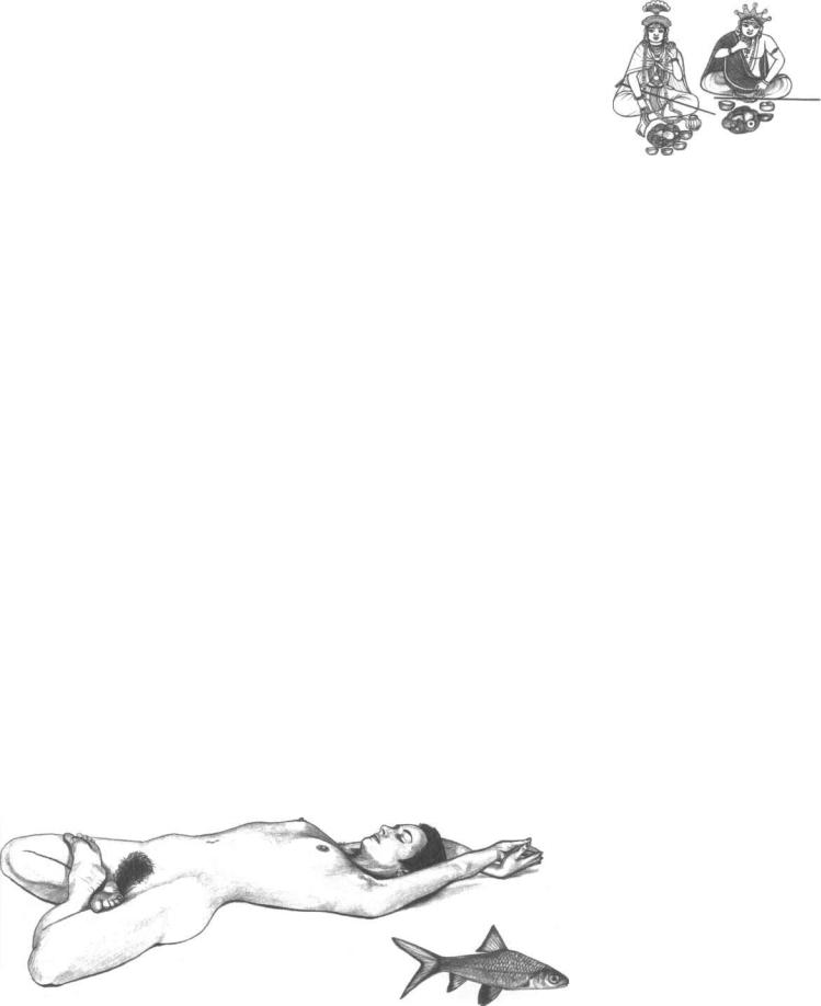 The fish posture (matsyasana) evolves from the lotus posture and is ideal for relaxation. It is particularly suited to follow bathing, prior to Tantric ritual. During practice of this posture meditate on yourself as a fish swimming against the current, while slightly moving the hips and pointing the fingers. It helps you gain control over watery elements in the body and endows your whole being with vitality.
