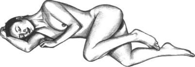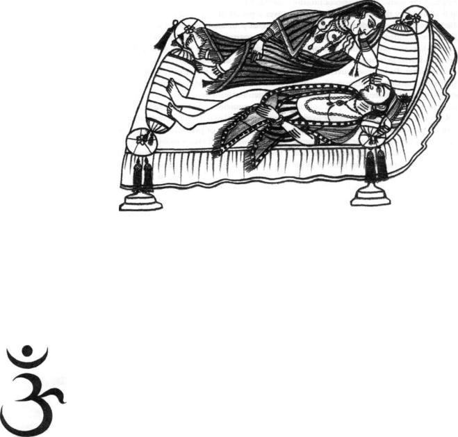 Use a scented pillow of suitable size, neither too hard nor too soft, to avoid strain on your neck. Be sure to keep your feet warm, either with bed socks or adequate covers. When you practice Dream Yoga with your partner, you both should lie on your rights side, your bodies closely embracing. The man should then imagine the Kundalini, the "inner woman," awakening and taking the form of a goddess. Imagine that you are two sisters, the left and right subtle nerves, intertwined like the caduceus wand of Mercury, each enhancing the finest qualities of the other. Entwine your feet and hands, slightly bending the knees. Try to keep a slight pressure on the right side of the face and throat; this can be done either with the pillow or with the right hand or arm. You'll find that in this position profuse saliva is produced. Let the saliva collect in the mouth and slowly swallow it, all the while imagining that it is feeding