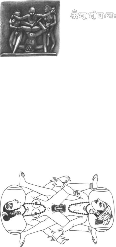 Complex love-posture of a Tantric type. The man is inverted, so energy is channeled to his head. His three female partners mimic the roles of the three main subtle nerves, which instill transcendence. This love-posture is a Yantra designed to create high energy channeling. From a stone sculpture, Khajuraho, India, circa eleventh century.