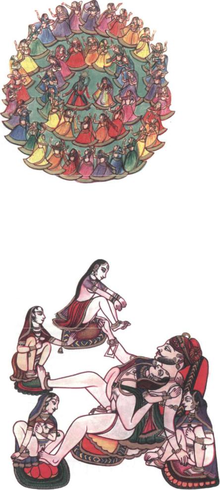 The circular erotic dance of Krishna with the beautiful Gopis expresses both the inner swirling of sexual energies in the psychic centers of transformation and the swirling